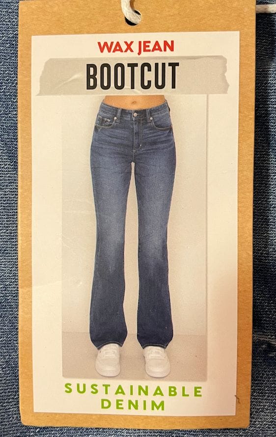 Below are three photos of tags attached to denim bootcut jeans found at Steps New York Clothing Company in New York City. The first two show examples of unbacked claims while the third illustrates what omitting crucial information looks like (see photo captions).