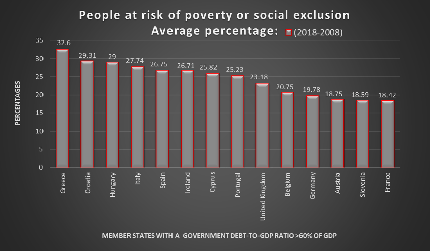 As in all other such previous cases, the increase in sovereign debt in these Member States did not originate as a result of supporting social improvements. As the Graph C shows, the average percentages of people at risk of poverty or social exclusion in the period 2008-2018 for Italy, Belgium and Austria are 27.74%, 20.75%, and 18.75%, respectively.