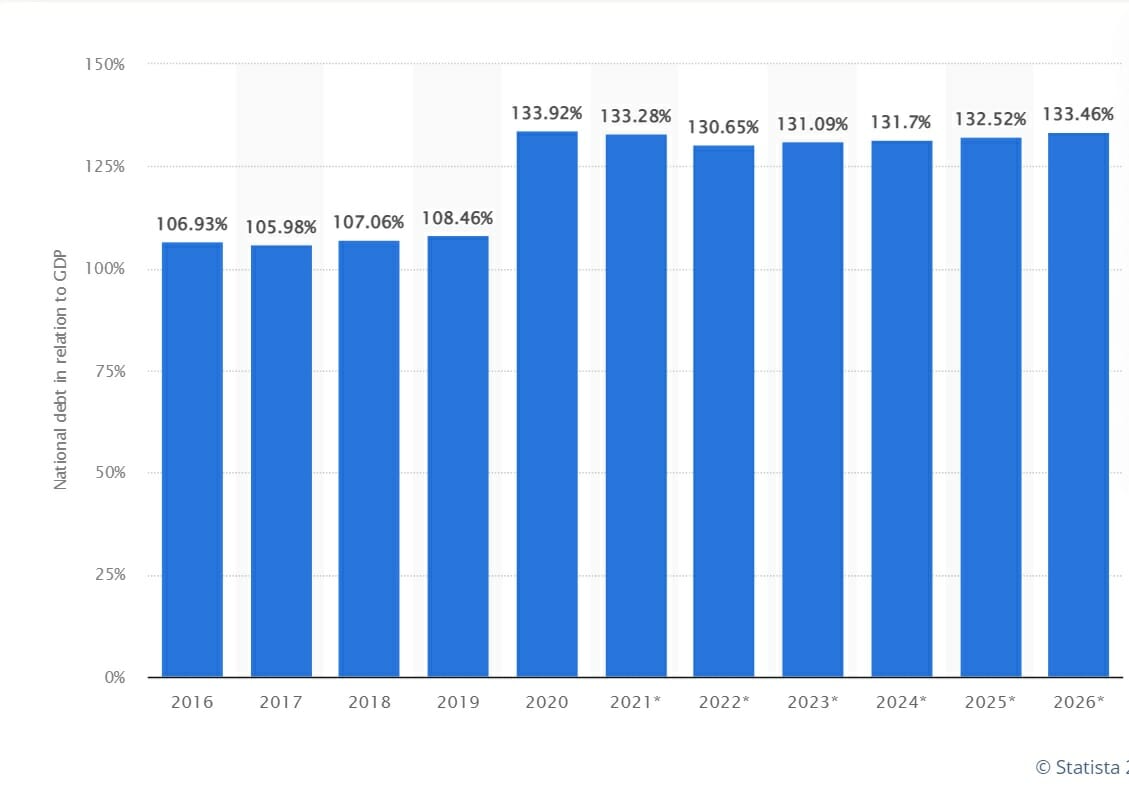 That figure doesn’t make the US the highest indebted country in the world. That award goes to Japan (note that it is a country that controls its own currency, just like the US does): As of December 2019, Japan had a ratio of 237%, nearly double that of the US.