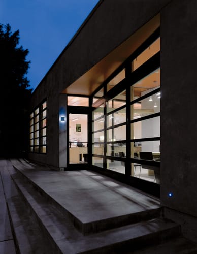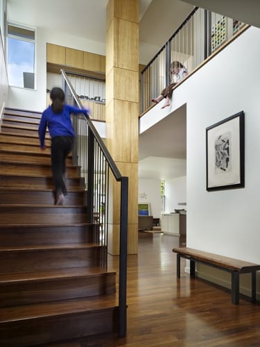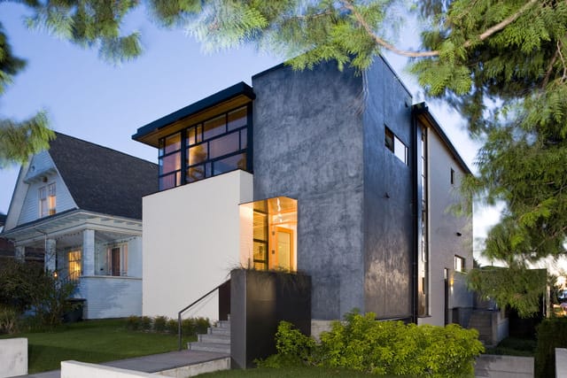 In the photo: A 1920’s home in very poor condition was demolished and replaced with this modern design, on top of Seattle’s Queen Anne Hill neighborhood. A detached commercial structure in the rear yard allows the owners to live and work on the same property to eliminate commuting. Photo credit: Benjamin Benschneider, 2013.