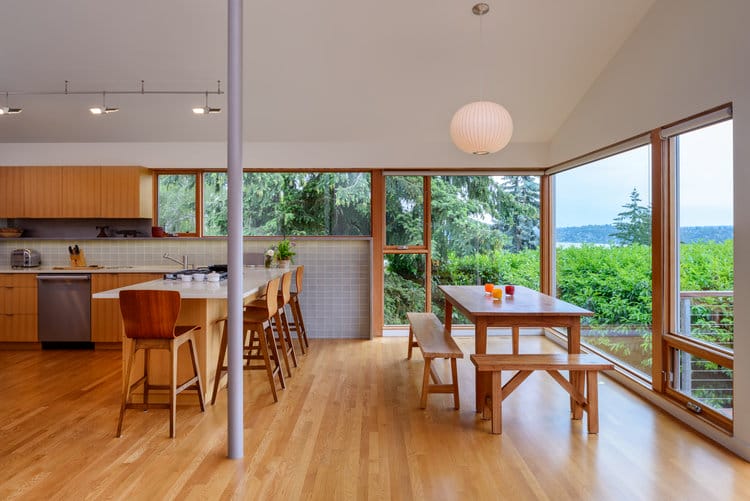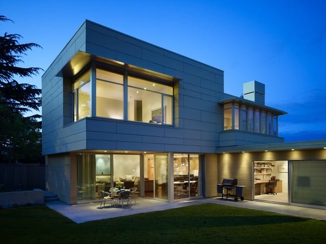 In the photo: In the Sand Point neighborhood of Seattle, a 1950s rambler was expanded and updated with triple-pane windows you can find with this window replacement company, upgraded insulation, new energy-efficient heating and ventilation, and LED lighting. The exterior features a green roof, and photovoltaic panels, sustainably harvested cedar siding, and low maintenance fiber-cement siding. Photo credit: Benjamin Benschneider/The Seattle Times.