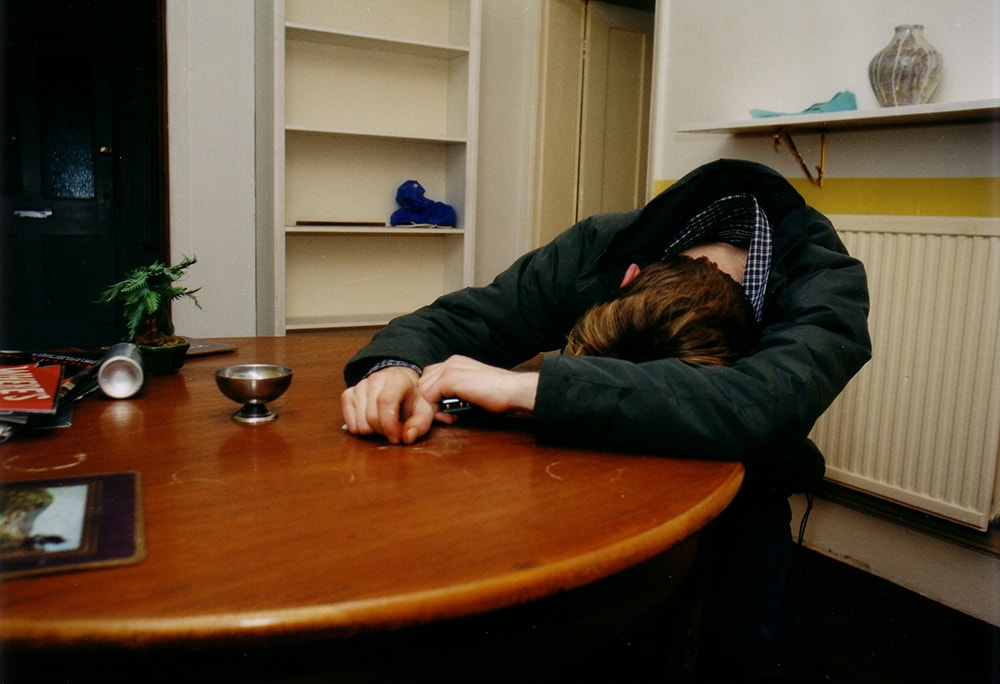A resident of the ex forces hostel in east London, sleeps at a table in the ‘communal area’ of the Ex-Forces hostel after a drunken night out. December 2001.