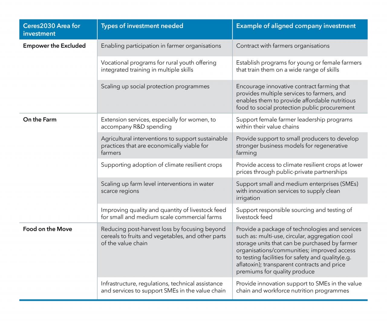 The action outlined by Ceres2030 takes place across three broad areas: Investments to empower the excluded (for example: strengthen farmer organizations, education for rural youth, social protection); investments on the farm (for example farm extension, irrigation, finance, infrastructure, R&D, production subsidies); and investments for food on the move (for example infrastructure and technical assistance to help small and medium enterprises, investment in storage and sustainable energy and cold chains).