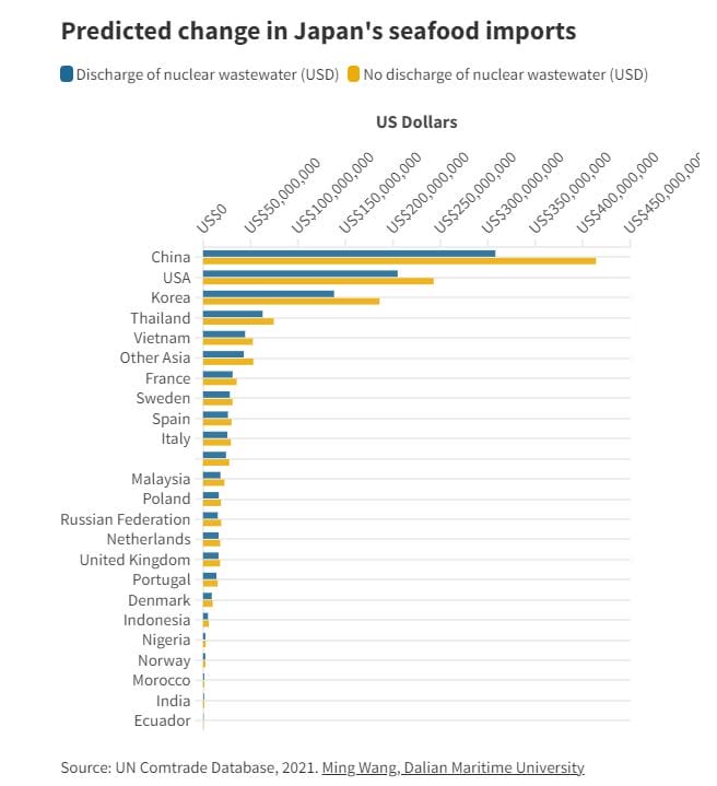 What people think (about the discharge) is closely related to the amount of Japanese seafood imported by each country. The higher the amount of Japanese seafood imported by a particular country, the more negative public opinion is likely to be, according to computer modelling.