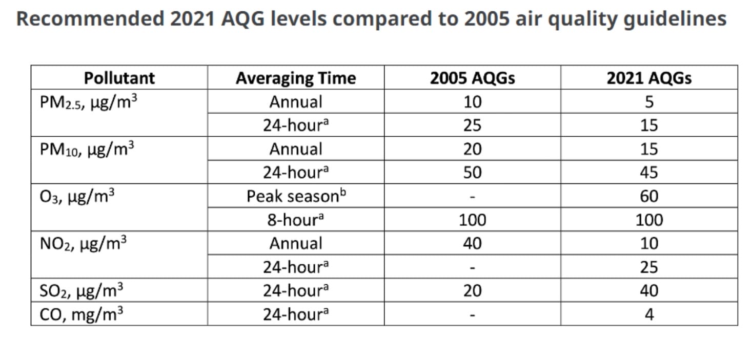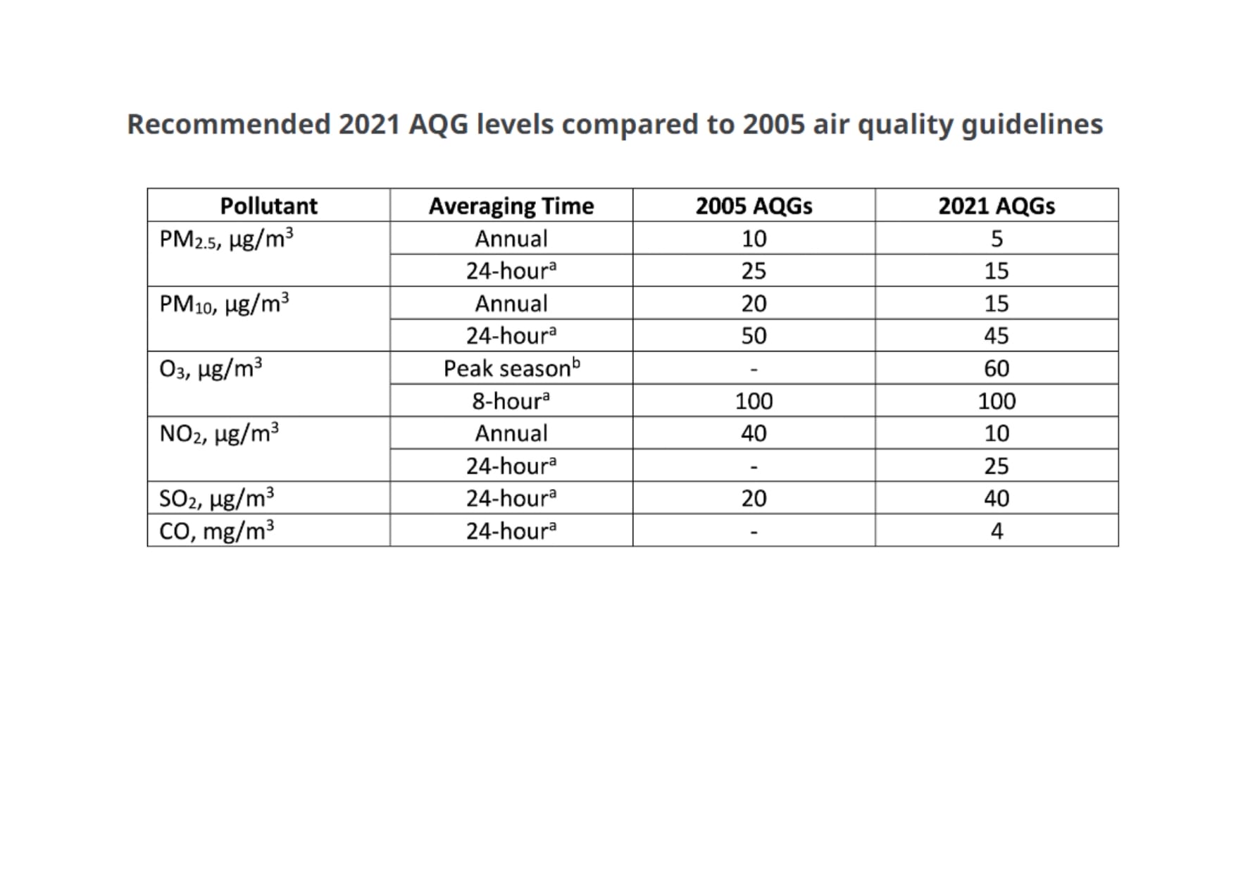 The WHO guidelines recommend levels for the most common pollutants. For PM2.5, the recommended limit is 5 micrograms a cubic metre (µg/m3).