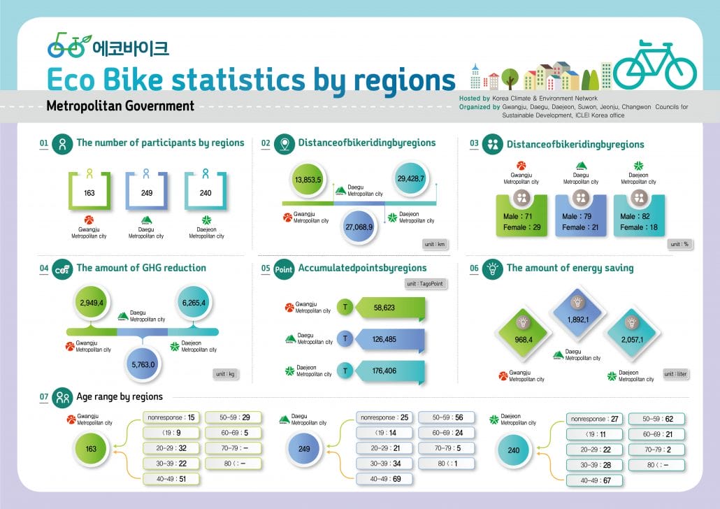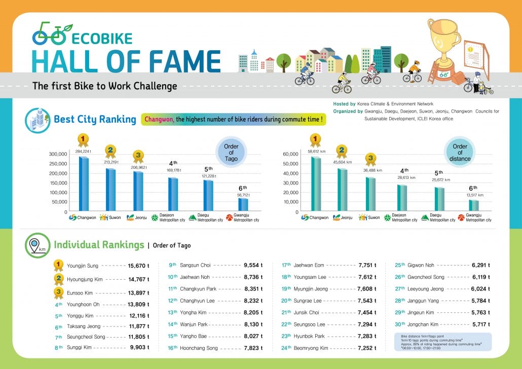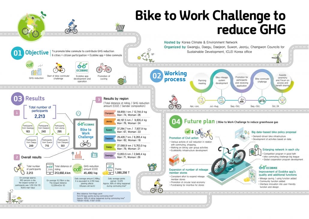 Cycle to work, track your ride, earn points, and get a chance to win, all while fighting climate change. This is the simple but effective idea of the first Korean “Bike to Work Challenge,” an initiative funded by the Korean Climate and Environment Network, hosted by six Councils for Sustainable Development from the cities of Gwangju, Daegu, Daejeon, Suwon, Jeonju and Changwon, and organized in cooperation with the ICLEI Korea Office.