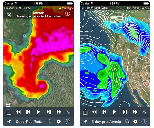 This app is designed for real “weather forecast enthusiasts”. Available for $3.99 on iOS, it offers access to hi-resolution radar mosaics for the continental US, which are both very accurate and easy to use. No other app offers similar super detailed images.