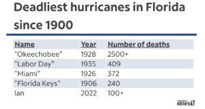 The most destructive hurricane in Florida history was Hurricane Okeechobee in 1928, which killed 2,500 people followed by the Labor Day Hurricane in 1935 which killed 409 people. A chart by Spectrum News 1 shows Hurricane Ian as one of the top five deadliest hurricanes in Florida.