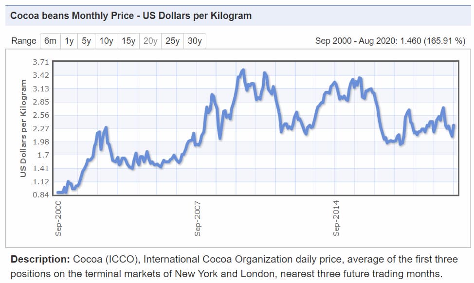 Take the chocolate industry for example. The industry itself is valued at $100 billion, while most smallholder cocoa farmers in West Africa (where 70% of the world’s cocoa comes from) live on less than $1.25 per day, meaning they receive approximately just 6.6% of the retail value of a chocolate bar. These smallholder farmers live a risky existence—their livelihood depends on a temperamental global commodity market where prices can plummet by as much as 25% within only three months.