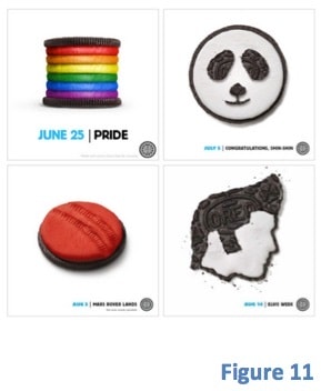 For instance, Oreo, the famous biscuit, to engage with the consumers and promote its brand, shares daily a picture on facebook, where the image of the famous biscuits is associated with particular events or news of that day, as shown in fig 11. With this marketing campaign, the company facebook page added more that 5 millions like, increasing the engagement of 110%.
