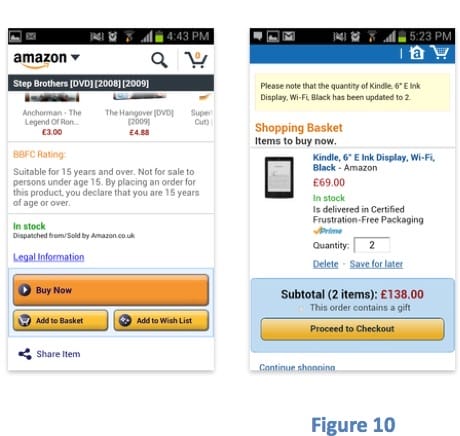 Amazon has designed an extremely powerful strategy to combine all the advantages related to the mobile shopping. As shown in figure 10, from the mobile phone, it is possible to search the item and compare the other products through a barcode scanner. The automatic data entry for the payment reduces the risk of typing mistakes. Moreover, there is the possibility of synchronise the shopping basket with different devices.