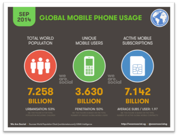 The penetration of the mobile phone in the current society can be defined as one of the main technological revolution of the century. in 1997, when it was just at the beginning, 215 million people owned already a mobile phone, increasing to 1.16 billion in 2003 (Bauer et al., 2003), to reach more than 3.6 billion nowadays (Kemp, 2015). Currently, as illustrated from figure 1, the number of mobile users represent more than half of the world population. Considering the fact that a significant number of people owns more than one mobile phone, the number increases extensively, covering roughly 99% of the total population (figure 2).