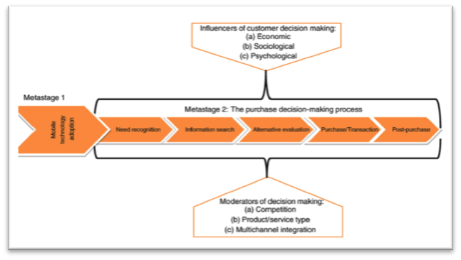 As claimed from Srivastava (2005), who runs an individual voluntary arrangement company, no technological innovation can happen without a change in society. Indeed, the mobile phone represents a “social object” which has a significant impact on the consumer behaviour. Mobile phones have a direct impact on all the stages of the consumer decision process, as showed in figure 4, acting as a moderator of economic and social factors and decreasing the impact of the five competitive forces (Porter, 1979) on the product of interest (Shankar and Balasubramanian, 2009).