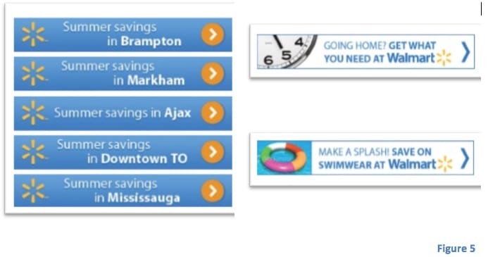 Walmart used LBS to target customers that were travelling nearby the five stores in the Toronto area. Their strategy focused on specific time and the weather of the day to target their consumer with specific promotions, as illustrated in figure 5. The strategy generated high engagement from the customers and increased the sales of swimwear. (IAB, 2014)