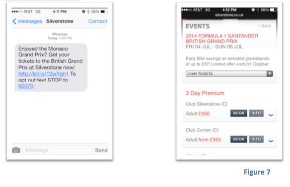 Silverstone used a very simple SMS marketing campaign to promote the Formula 1 British Grand Prix, which generated the increase in the ROI of 680%. They selected 45000 users from a database of the Gran Prix fans and sent them a simple SMS. Following the link contained in the message, they could directly purchase the ticket from the events page, as shown in figure 7.