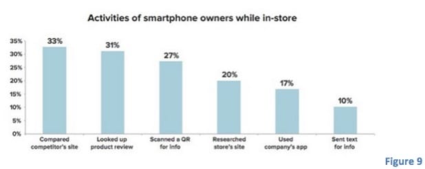 Mobile shopping represents another strategy that allows consumers to have access to a personalised service from their mobile phones. More than 60% of users purchased a product/service from their mobile phone or used it inside of the store, to look for additional information about the products (Miller, 2014). As illustrated from figure 9, the main activities with the mobile phone in store include the comparison with other products, research of product reviews and using the scanning code to gathered additional information (Duggan, 2013).