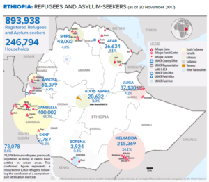 Ethiopia provides protection to 894,w000 refugees and asylum seekers from 24 countries, making it the second largest hosting country in Africa and the sixth hosting country worldwide. The largest groups are: South Sudanese (420,000) living along the Southwestern border; Somali (253,000) residing along the Eastern border, and Eritrean (169,000) living mainly along the Northern border.