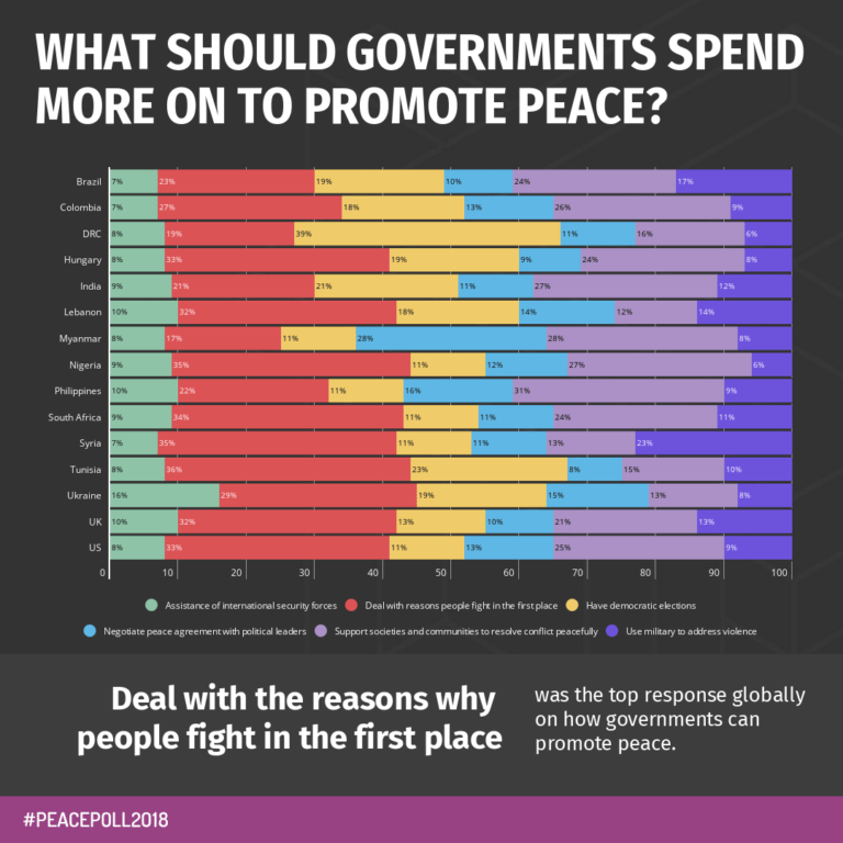 When we asked people what was the most effective approach to creating long term peace, top of the polls was “dealing with the reasons why people fight in the first place,” followed by “supporting societies and communities to deal with conflict peacefully.” Prevention is clearly better than cure. These two elements constitute “peacebuilding” — a relatively underutilised tool compared to military intervention and humanitarian aid, both of which were ranked lower.