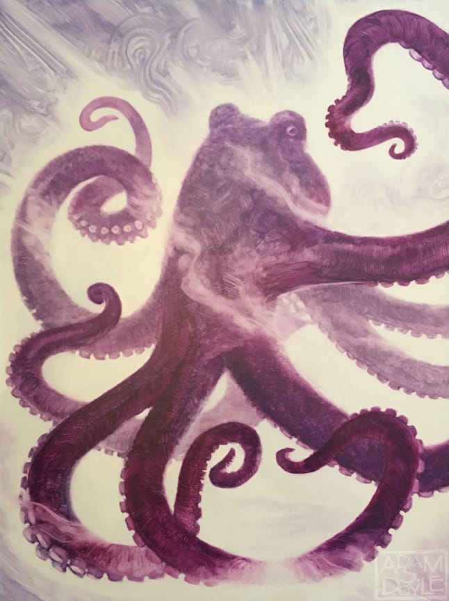 I spoke about the big themes. Now I’ll just list off an eclectic mix: going for walk in the woods, the softness of clouds from 30,000 feet, underground caverns, the protests and marches against the current administration, biking through NYC blasting Sleigh Bells in my earbuds, Gorillaz, Hans Zimmer, the mountains of Iceland, the old neighborhoods of Rome, hitchhiking across New Zealand, the dolphins of Bali, Burning Man, the smell of waffles, the films of Christopher Nolan, Edgar Wright, the significance of Wonder Woman, the stories of HG Wells, Alan Moore, Harold & the Purple Crayon, Calvin & Hobbes, Sherlock Holmes, Joseph Campbell, Mary Shelley, Neil Postman, Oliver Sacks’ accounts of his patients, acts of kindness, enlightening podcasts, videos of unlikely animal friendships, the paintings of John Singer Sargent, Jenny Saville, Andrew Wyeth, the drawings of MC Escher, Heinrich Kley, Hokusai, and Duchamp for making a mess of what we consider art, catching a frisbee from a huck down the field, landing in a new country, Westworld, American Gods, Rick & Morty, Black Mirror, the Planet Earth series, self-driving cars, artificial intelligence, interplanetary travel, aliens, ghosts, cryptids, philotic connections, quantum entanglement, the kiss that confirms a woman is into me too, falling in love, a girlfriend wearing my sweatshirt, Netflix with a pile of pets, puzzles, riddles, trivia night, labyrinths, doppelgängers, and of course, octopuses.