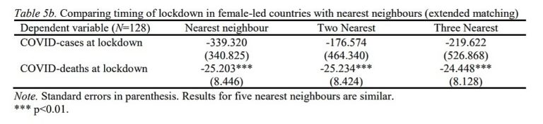 From the beginning of the COVID-19 pandemic, media reports noted that women leaders appeared to be handling the emerging public health crisis better than their male counterparts. In June 2020, a study carried out by University of Reading and University of Liverpool researchers found that this was indeed the case: the initial responses to the COVID-19 pandemic were demonstrably better in states with women leaders, “with male-led countries having nearly double the number of deaths as female-led ones.” Women leaders enacted lockdowns earlier than male leaders and were found to have adopted more decisive and clear communication styles, as shown in the study’s table 5 b: