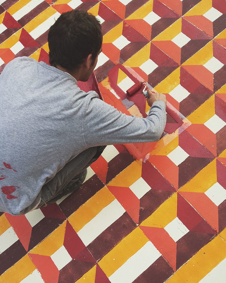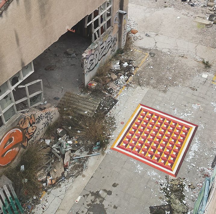 J.R.: In this project, I locate abandoned and grey floors and apply a pattern to them. It moves me to imagine that one day these floors harboured experiences, and were part of someone’s daily life, but that now they are left forgotten. Through my intervention, I allow this sensation to flourish – and I try to offer a testimony of these past lives.