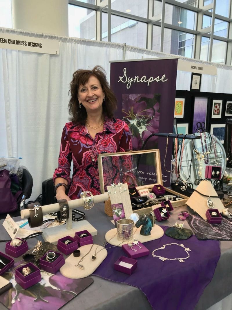 All of the artists I met found inspiration in some part of the neuroscience world; the structure and process of neurons throughout the body and especially in the brain, making us who we are. One of them is Kathleen Childress, an artist, poet, jewelry designer, and gemologist. She rounds out her busy schedule with independent communication consulting and nonprofit board work. Kathleen’s jewelry art not only includes neuro-inspired pieces, but also includes custom work, conveying meaningful events, people, places, work, and memories, telling personal, unique stories through the beauty and magic of gems and metals.