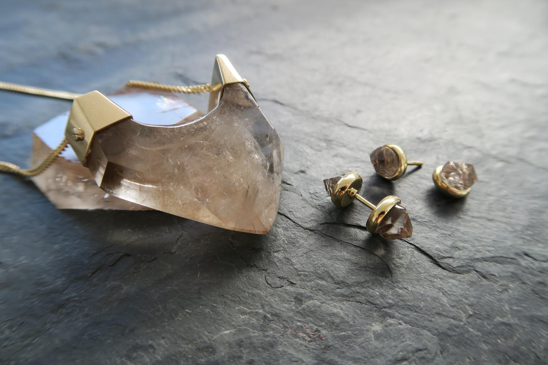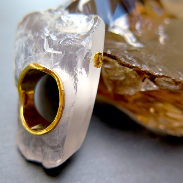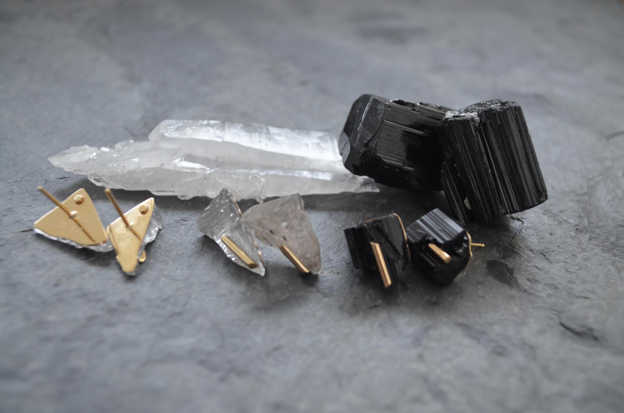 My way of working is very organic. Once I find the initial piece that catalyzes my creative process, I collect other materials that inspire me. I start with one point of reference and it is about simplifying and striping things down in order to showcase the purity of the stone. I don’t like to embellish. This last collection got inspired by a raw piece of an amethyst I found in Peru. I fell in love with the natural texture of the stone and came up with the concept of creating a collection mixing the roughness of the crystal with very modern metal work. For the gold finishings I referenced clean modern design from home furnishings and hardware. I let the stones dictate the form and the shape and I work the metal around them. To create a collection, I sketch, and then cut the stones. Then I go back to sketching until I get the right balance. After that, I start creating prototypes and from there the final piece.