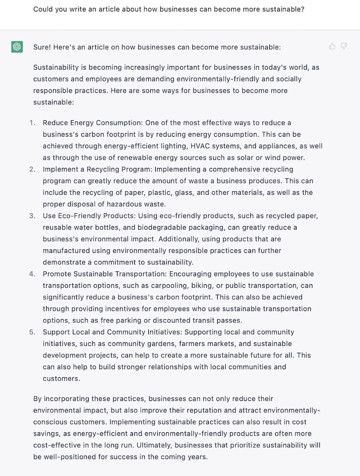 For example, when provided with the following prompt alone: “Could you write an article about how businesses can become more sustainable?” with no keywords or guidance, ChatGPT opened with a couple of sentences, listed five bullet-pointed ideas about sustainability, and then closed with a short concluding paragraph.