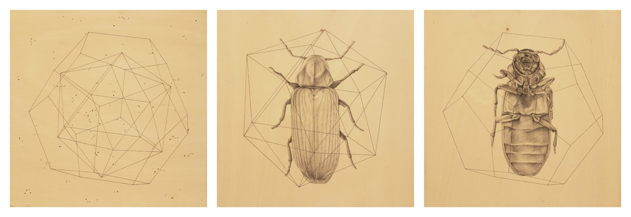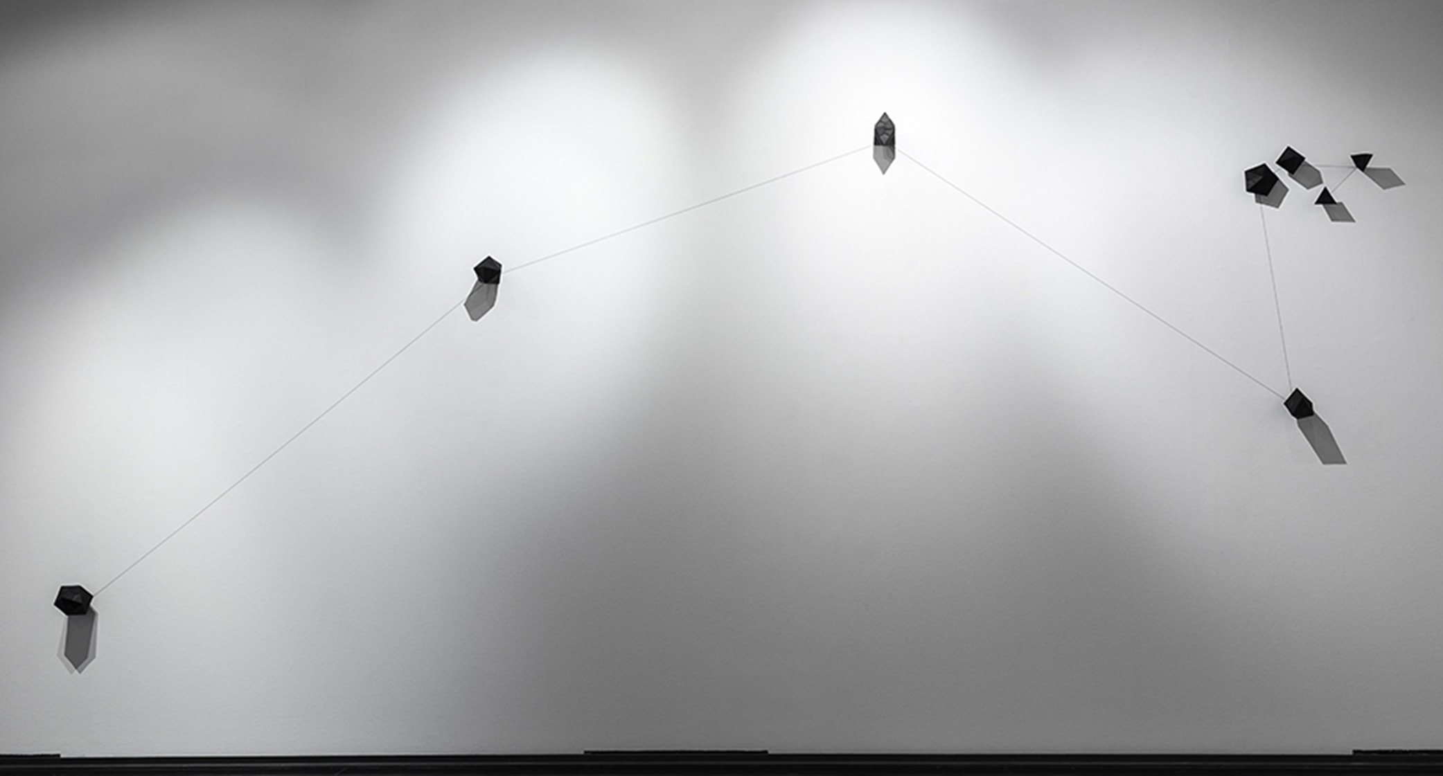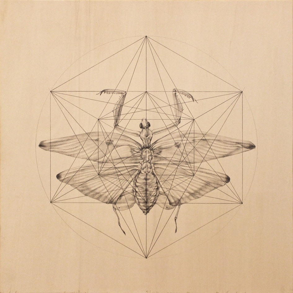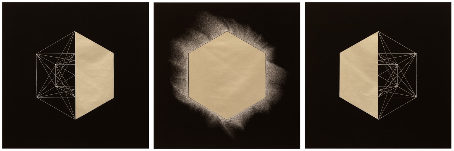 His research ranges from physics, astrophysics, science, mathematics, philosophy and alchemy. In his beautiful pencil drawings there is always a perfect geometry, a mathematical and philosophical hidden formulation applied to a symbolic and truly fascinating natural world. His black paper modular sculptures -that remind Japanese origami- in their aesthetic balance manage to hold together the extremely complicated foundations of “Platonic Solid” geometry.