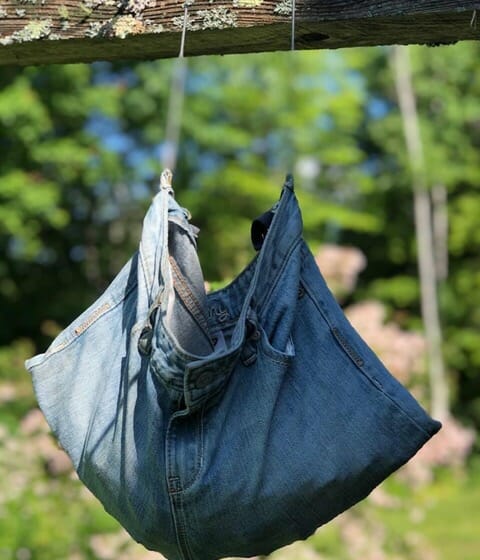 - Old blue jeans are easily remade into clothesline clip holders, bags, and even backyard games