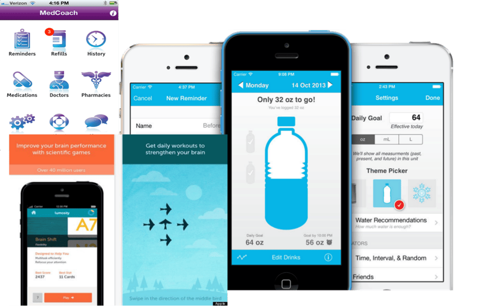 Another interesting aspect are the challenges faced by mental health patients apart from the apparent and scientifically understood neurological effects. Patients suffering from mental health disease are challenged by even small and seemingly mundane tasks such as brushing teeth or bathing, and potentially some of the apps can help such patients to maintain a regular rhythm. Another app which is extremely beneficial for patients with mental disorders is Water Logged. Dehydration is any form, either natural or as a side-effect of medicines that aggravates any disease. This app charts and reminds the user to drink enough water and keep the body hydrated. Similarly, there are apps for pill reminders such as MedCoach, which reminds the user about their medications and dosage with timed notifications.