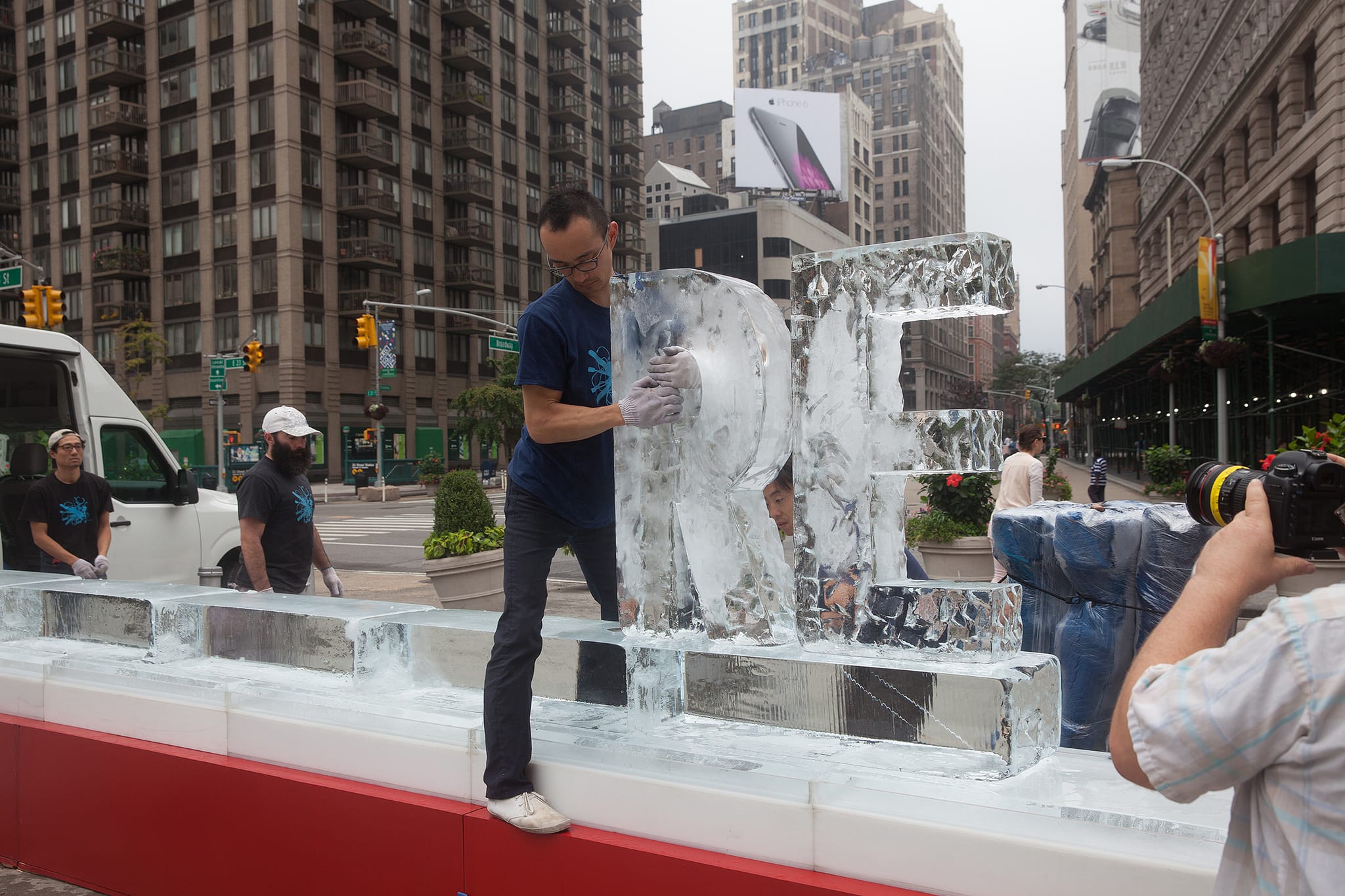The project, selected for the 2014 Human Impacts Institute’s Creative Climate Awards and sponsored by 350.org and the NYC Department of Transportation, follows several earlier ice projects by LigoranoReese, which they call “temporary monuments.”