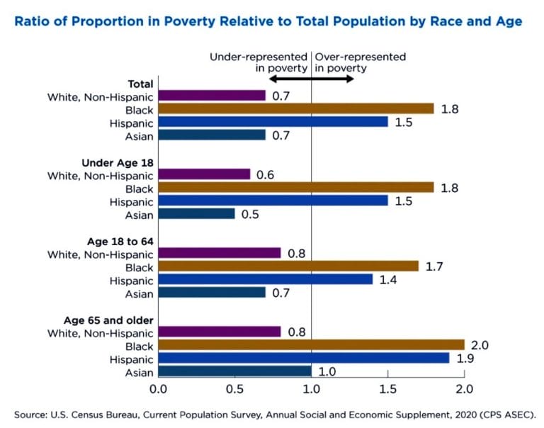 Nevertheless, Black poverty is still out of proportion to the Black population, which represents “13.2% of the total population in the United States, but 23.8% of the poverty population.”