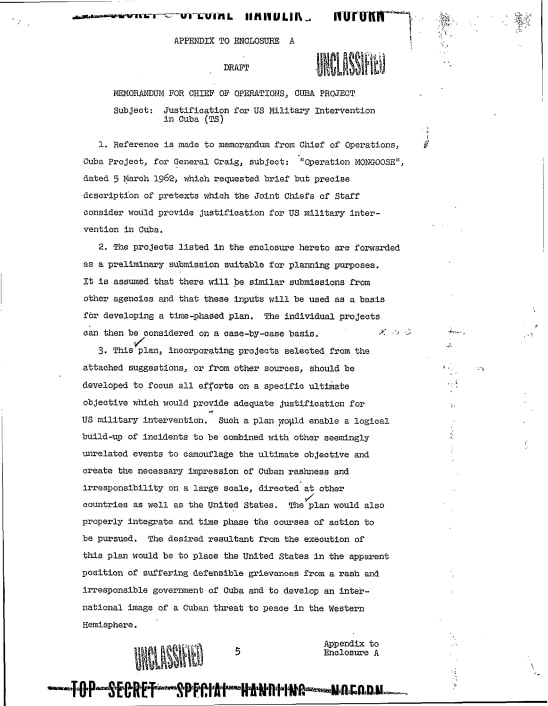 The plan included remote-controlled civilian aircraft which would be secretly repainted as US Air Force planes, a fabricated “shoot down” of a US Air Force fighter aircraft off the coast of Cuba, the assassination of Cuban immigrants, sinking Cuban refugee boats on the high seas, blowing up a US ship, and orchestrating terrorism in US cities.