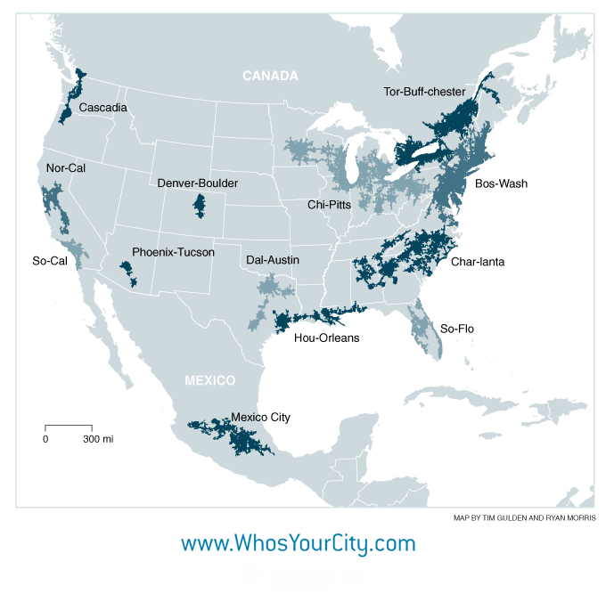The idea is that we’re not just clustering in cities, but in regions of cities. Richard Florida put forward three mega-regions with the most economic output. These are Greater Tokyo with an annual product of $2.5 trillion, the Boston-Washington corridor on the US East coast at $2.2 trillion and the Amsterdam-Brussels-Antwerp region at $1.5 trillion. Compare this to the GDP of France, which is $2.47 trillion, let alone that of a smaller developed country like Switzerland, which is $660 billion according to the World Bank.