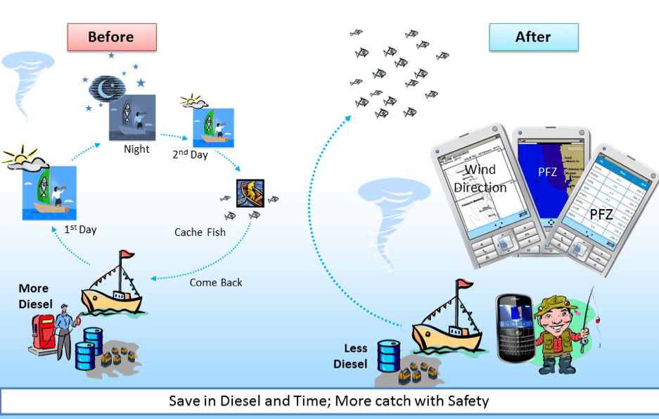 Ultimately, the target group for this collaborative innovation is the vulnerable fishermen population, the majority of whom are below the poverty line. This service not only positively impacts their livelihood with improved catch rates and reduced costs, but also helps to prevent both the loss of fishermen’s lives and the damage to equipment such as boat and fishing gears. Moreover, the reduction in diesel consumption resulting from the use of this service leads to a less polluted environment.