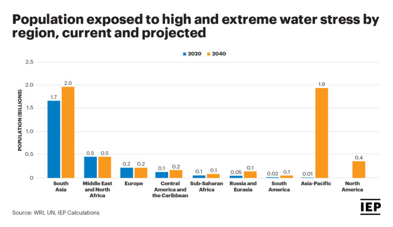 Globally, 2.6 billion people are exposed to high and extreme water stress, with the majority living in South Asia and the Middle East and North Africa region. By 2040 this number will grow to 5.4 billion, driven by increasing water stress in the Asia-Pacific.