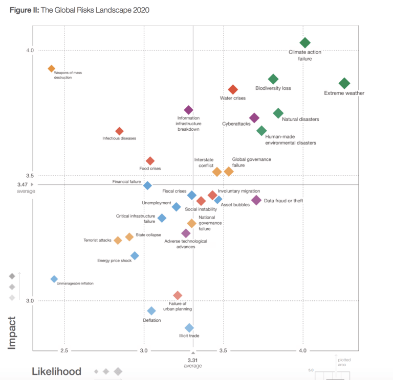 Nature loss is more than a bit risky. Biodiversity loss is one of the top three ranked risks in the world in terms of impact according to the Economic Forum’s 2020 Global Risks Report. In addition, at least six more top risks in terms of impact are closely linked to nature loss, including climate action failure, water crisis and infectious diseases.