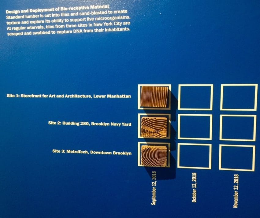 And what about the Bio-receptive material at Storefront for Art and Architecture in Soho, where the heavy sand blasting wood frames support live microorganisms, such as microbes, and analyzes them in the internal laboratory to capture DNA from their inhabitants?