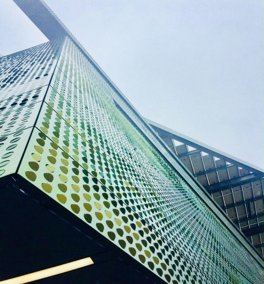 At the Bloomberg Center’s Cornell Tech building, by Pritzker Prize architect Thom Mayne, the New York DNA is part of the conceptual project. The outdoor texture has captured the skyline of Manhattan; the panorama is expressed through a green camouflage organic, steel skin. This shines and naturally changes during the day through the sun rays in the heart of Roosevelt Island’s campus. The aluminium panels register a continuous image which merges the river view scenery. Each pixel of the image is translated into the specific turn-and-tilt of a two-inch circular tab punched into the paneling. The depth and rotation of each of the tabs determines the amount of light reflected. This pixel map and its algorithm were fed into a repurposed welding robot and were created using an automatic girth welder, developed in collaboration with Cornell and MIT students.
