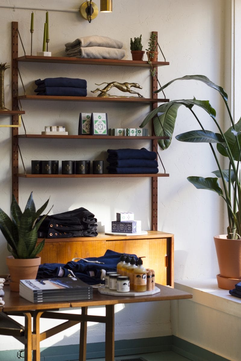 With the help of a backbone team including Sam Wessner (Co-Creative Director), Christman Hersha (Director of Operations), Alex Hatcher (Store Manager), Alex McEntire (Seamstress), Renee Kohl (Graphic Design & Retail) Noble Denim and Victor occupied a 19th-Century storefront at 1405 Republic St. in Cincinnati’s trendy Over-the-Rhine neighborhood. With a scent of blood orange, cypress and fig, custom candles from Joya Candles in Brooklyn, New York accent the newly renovated space. The inspiration behind the store was to give an insider look into the brands with a sewing workshop at the store, where the team creates custom hems and makes in-house products and samples. The space is a melding of the two brands boasting mid-century modern furniture and unexpected elements like green tile, painted green floors and stucco walls giving the store a modern, clean feel reminiscent of a craftsman’s workplace.