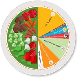 EAT-Lancet’s dietary recommendations are based on the assessment that there is a lack of harmonization between diet and its impact on the planet and that, in order to feed 10 billion in 2050, a universal “healthy reference diet” is needed. This reference diet comprises a range of plant-based foods, unsaturated fats, low amounts of animal-based foods, and small amounts of refined grains, processed foods, and added sugars. Figure 1 below is an illustration of this reference diet, i.e. the “planetary health plate.” Approximately half the plate is comprised of vegetables and fruits. The other half consists primarily of whole grains, plant protein sources, unsaturated plant oils, and (optionally) modest amounts of animal sources of protein.
