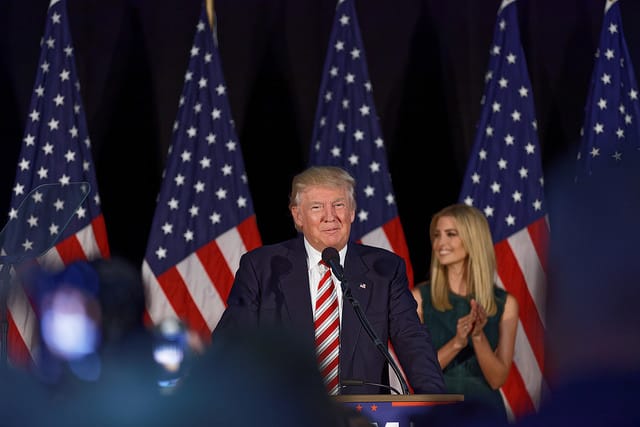 IN THE PHOTO: Donald Trump and his daughter Ivanka at a campaign rally in Aston, PE in 2016. Trump’s son-in-law and Middle East advisor, Jared Kushner, identifies as an Orthodox Jew. PHOTO CREDIT: Michael V. via Flickr.