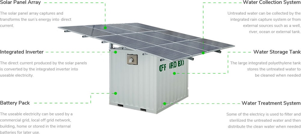 Solar Energy production systems in remote areas around the world, providing clean energy to poor rural communities, exist in abundance. But, OffGridBox’s proprietary technology not only produces energy at very low costs but also produces free of charge clean water to the community. This is essential as 1.2 billion people do not have access to electricity, whilst around 800 million do not have access to clean drinking water.