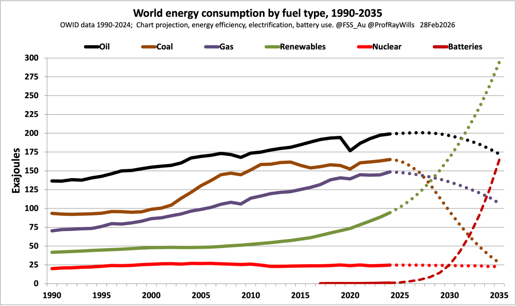Fossil and renewables consumption 1990-2025 and projection to 2030. Source: Wills and Newman, 2025.