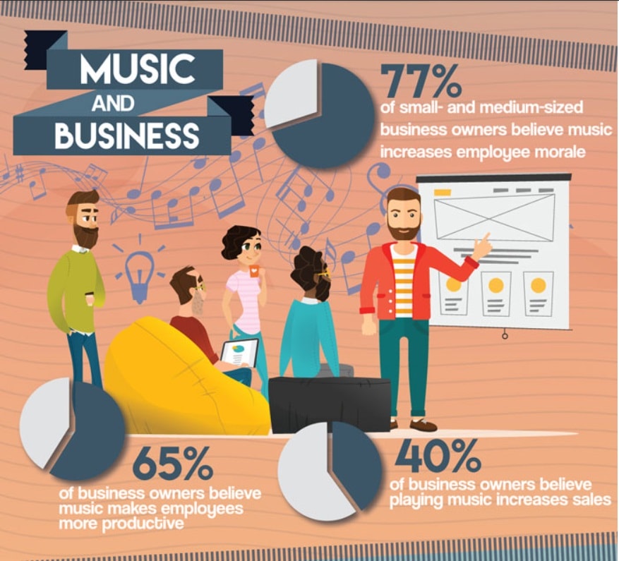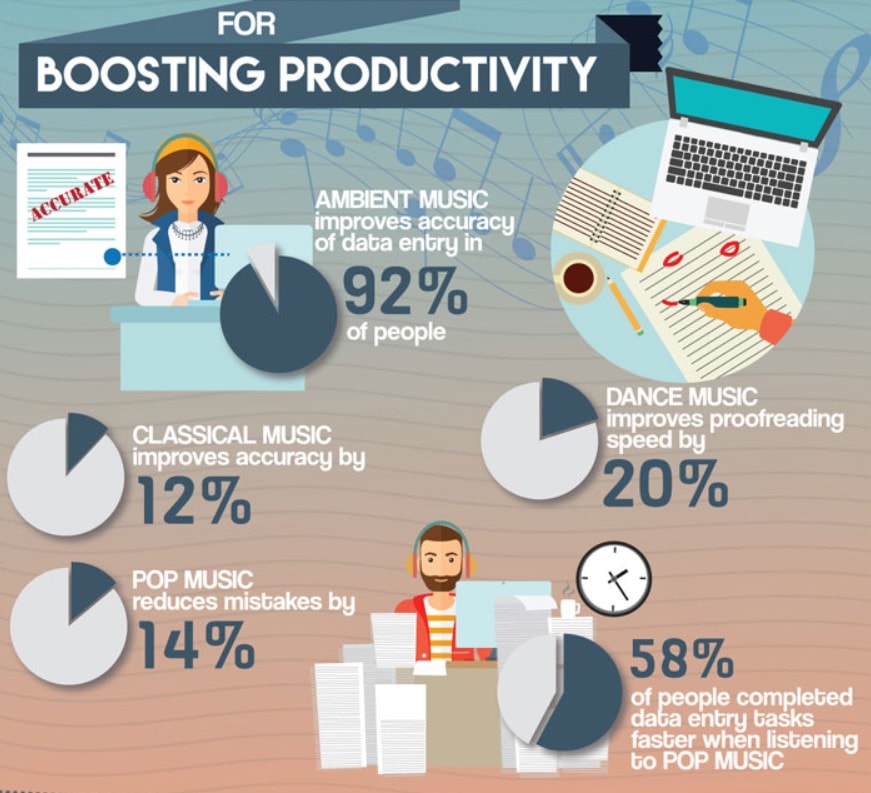 So it should come as no surprise that researchers have found that human productivity is also affected by music. One study found that 90% of workers perform better when listening to music, and 88% of employees produce more accurate work. Business owners agree, and 65% of business owners believe that music makes employees more productive.