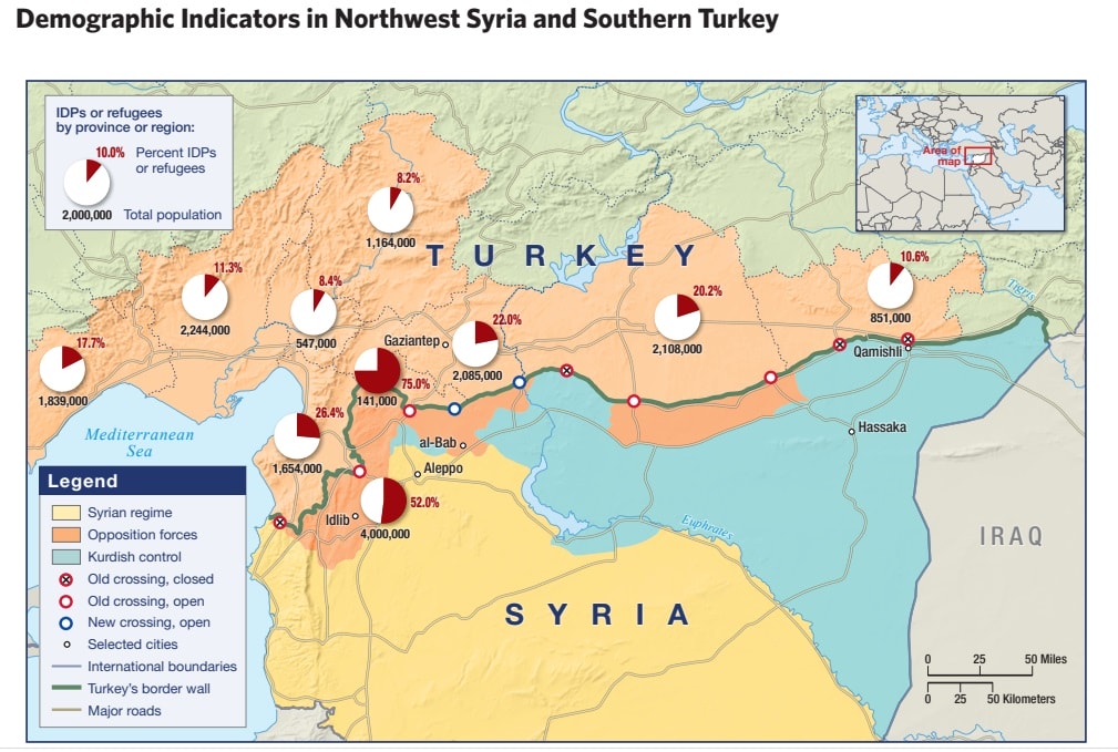 This sub-region is divided into separate areas of control—under the Syrian Democratic Forces in northeast Syria, and Turkey in several cantons. Border areas connect southern Turkey and regime-held Northwest Syria, with agreements that delimit zones of influence and public sector activities.