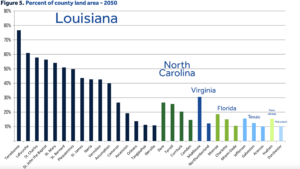By 2050, thirty counties throughout Louisiana, Florida, North Carolina, Texas, New Jersey, New York and Maryland will have more than 10% of their land area affected, amounting to 3 million acres.