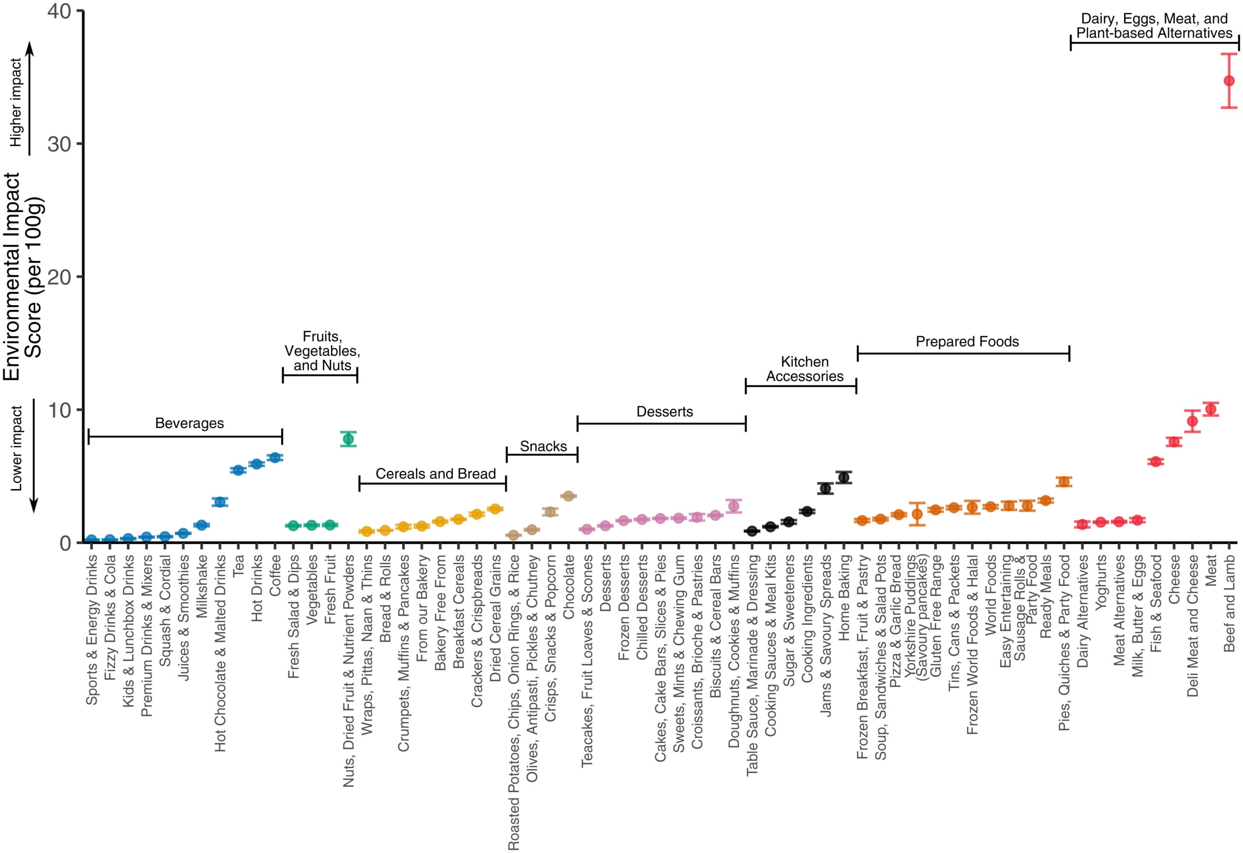 Unsurprisingly, beef and lamb scored the highest by far out of all included foodstuffs, amongst other high-scoring products such as other meats, fish, poultry and dairy. Dried fruit and nuts, nutrient powders, and desserts ranked with an intermediate score of between 2 and 5, and vegetables, savoury snacks and breads had some of the lowest (below 2) ranking impact scores.