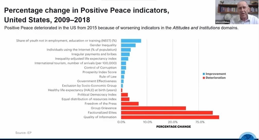 President Trump was elected on the premise he would ‘drain the swamp’, whereas what happened was the opposite: the rich got richer and the poor still struggled. There is a measure of societal resilience called Positive Peace, and in the U.S. it has markedly deteriorated over the last decade. In fact, it has had one of the largest deteriorations in the world.